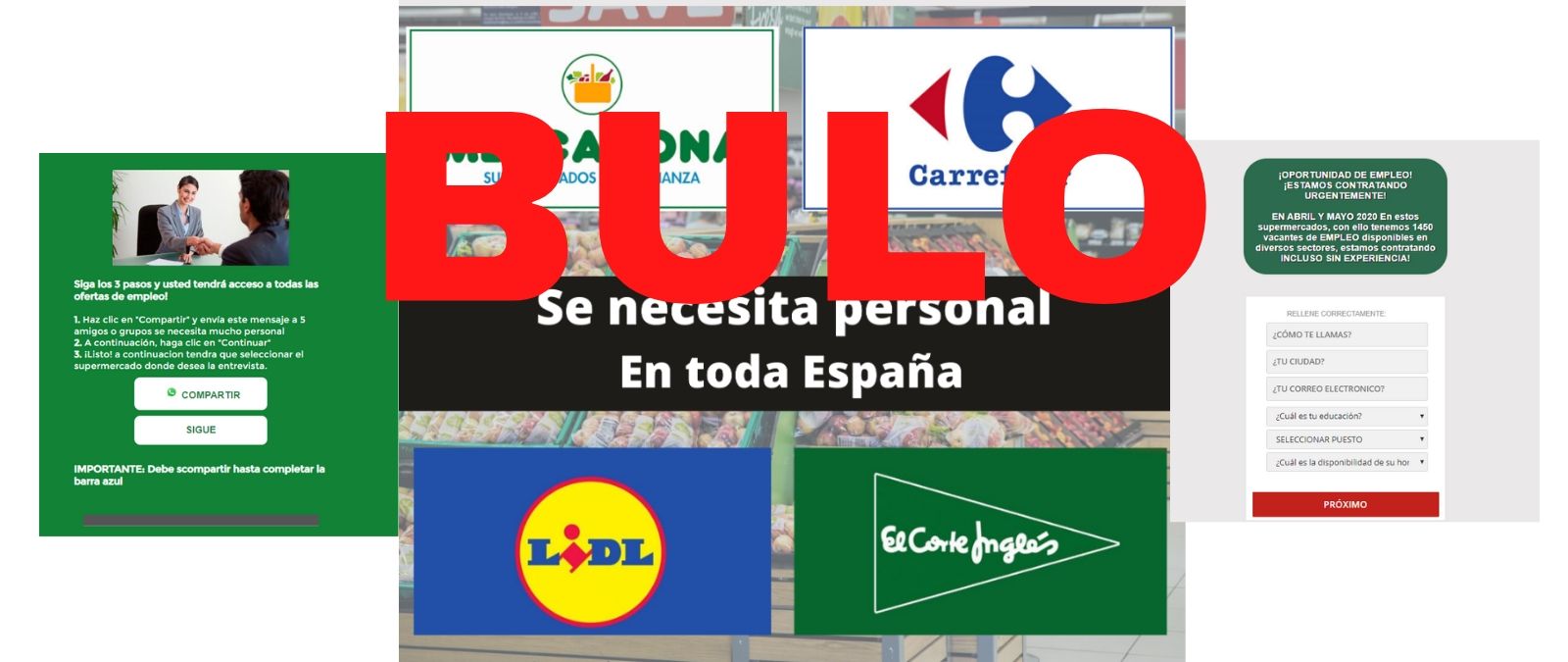 Nos habéis preguntado por esta supuesta oferta de empleo de los supermercados Lidl , Carrefour, Mercadona y El Corte Inglés en la que aseguran que en abril y mayo, coincidiendo con la crisis del coronavirus, hay 1.450 vacantes de empleo disponibles en diversos sectores. Es un bulo: se trata de un intento de phishing, una técnica que se utiliza para intentar quedarse con tus datos personales.