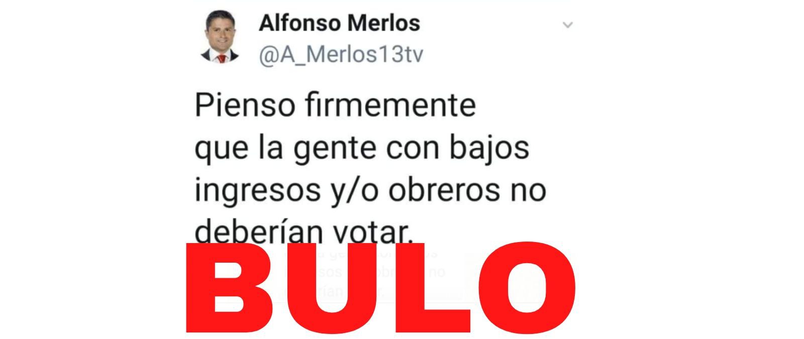 Nos habéis consultado por un supuesto tuit del presentador Alfonso Merlos que dice lo siguiente: "Pienso firmemente que la gente con bajos ingresos y/o obreros no deberían votar". Es un bulo. Es un tuit de una cuenta parodia, no de la cuenta oficial de Merlos.