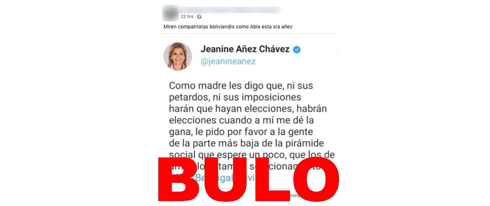 En definitiva, la presidenta interina de Bolivia, Jeanine Áñez, no ha tuiteado que habrá elecciones cuando a ella le "dé la gana". Es un bulo.