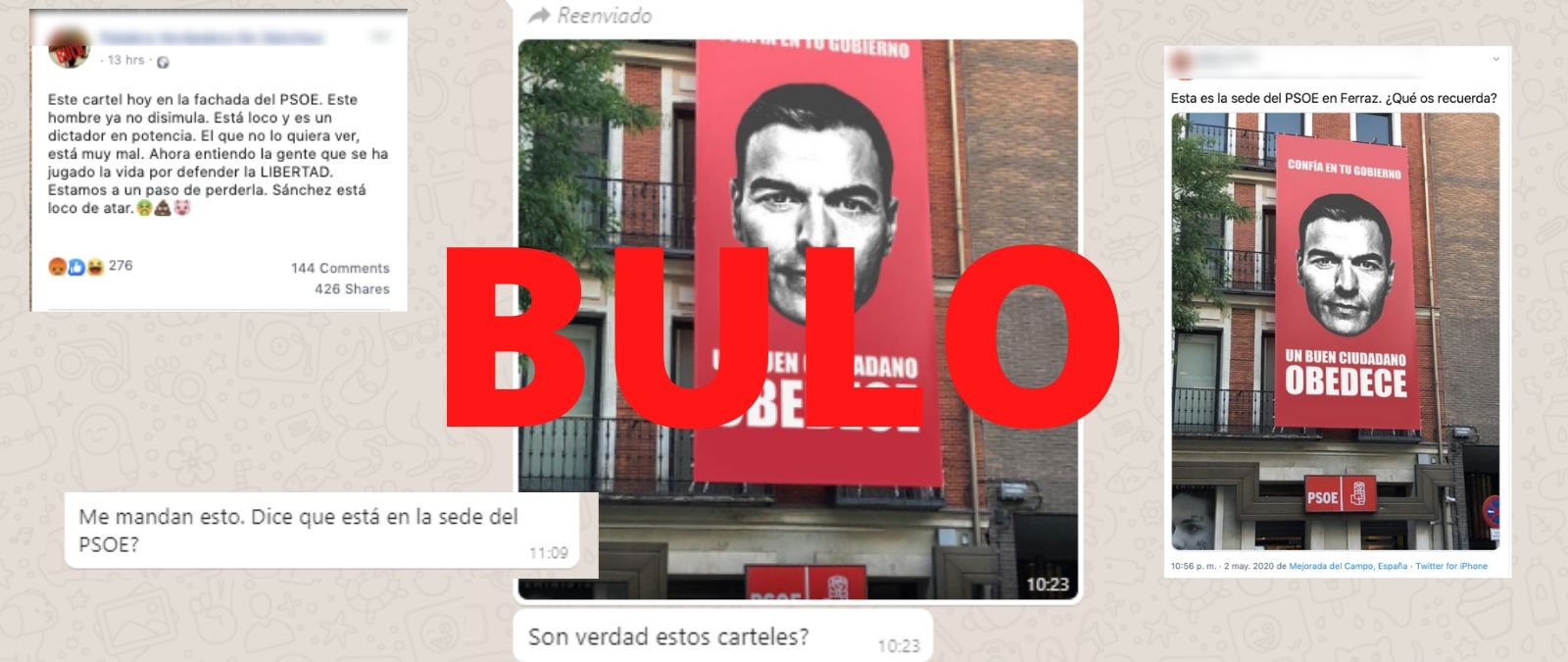 Por lo tanto, es un bulo que estas imágenes con la cara de Pedro Sánchez y el lema “un buen ciudadano obedece. Confía en tu Gobierno” sean reales. Son montajes.
