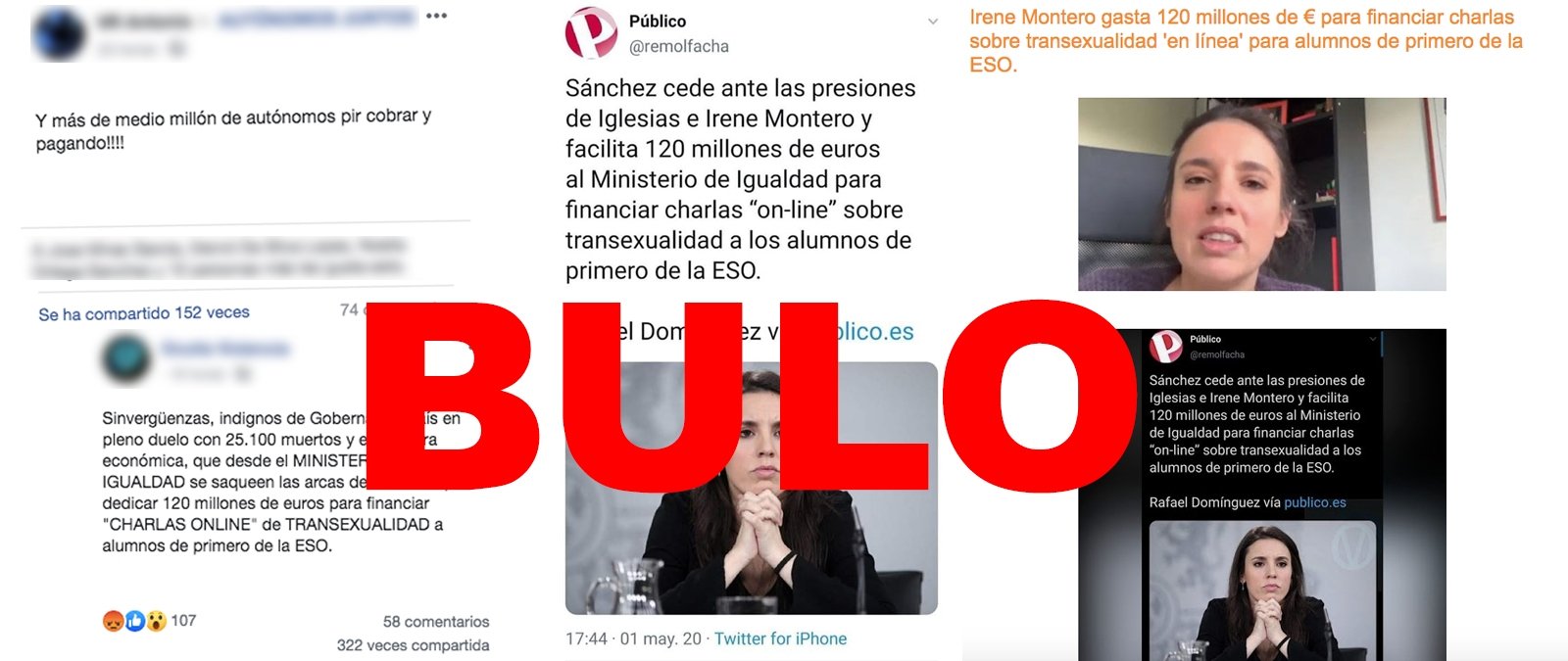 Las referencias en internet a la supuesta partida de 120 millones de euros para charlas online sobre transexualidad citan este falso tuit de Público. Por ejemplo, el blog La Voz de Murcia, afirma que Irene Montero "gasta 120 millones de euros para financiar charlas sobre transexualidad 'en línea' para alumnos de primero de la ESO" y adjunta una captura del tuit del que os hablamos: