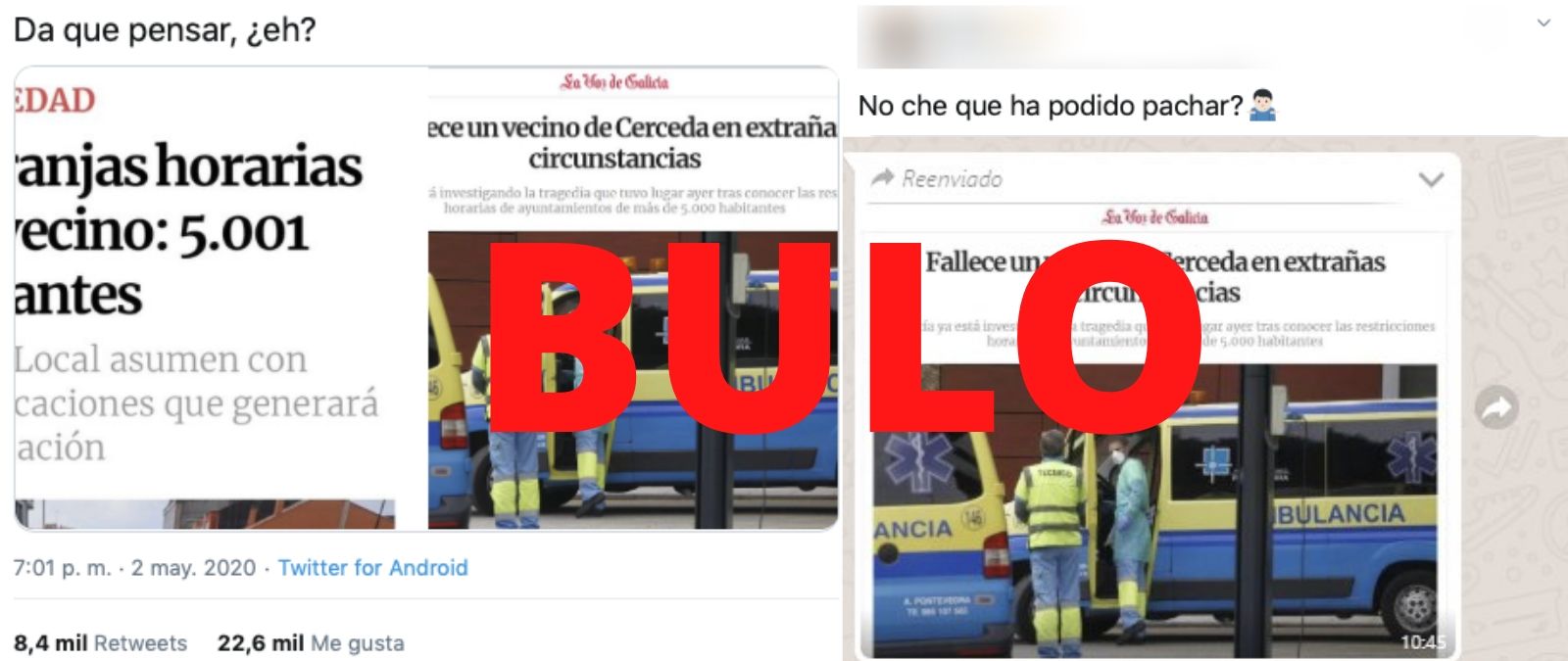La imagen del supuesto fallecimiento en Cerceda se difunde junto con una captura de un artículo de La Voz de Galicia titulado "Cerceda, con franjas horarias por solo un vecino: 5001 habitantes", un artículo real que publicó ese medio este 1 de mayo. En ese artículo se explica que este pueblo gallego supera el límite de 5000 habitantes que se impuso desde el Gobierno para poder poder estar exentos de franjas horarias para paseos y deportes en la desescalada del confinamiento.
