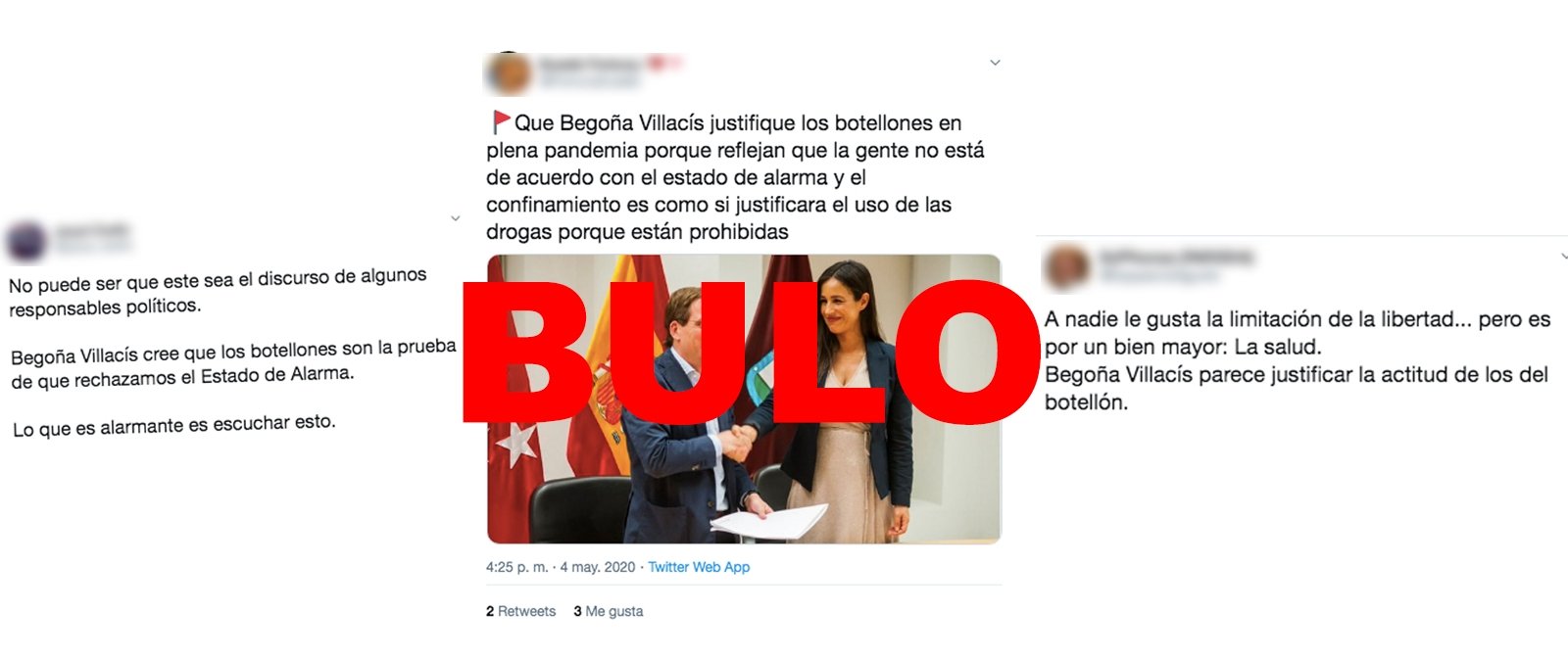 Begoña Villacís no ha justificado los botellones. La realidad es que se ha compartido la frase de Villacís incompleta, solo un entrecomillado. Villacís ha dicho que los botellones prueban que la gente "no sólo no asume que seguimos en una situación de alarma, sino que la rechazan ya, es decir, que quieren salir de ahí lo antes posible" y añadía que "eso no es así, y tenemos que tener en cuenta que (...) no nos podemos permitir una recaída". Por su parte, TeleMadrid ha borrado su tuit porque el texto de las declaraciones estaba "incompleto".