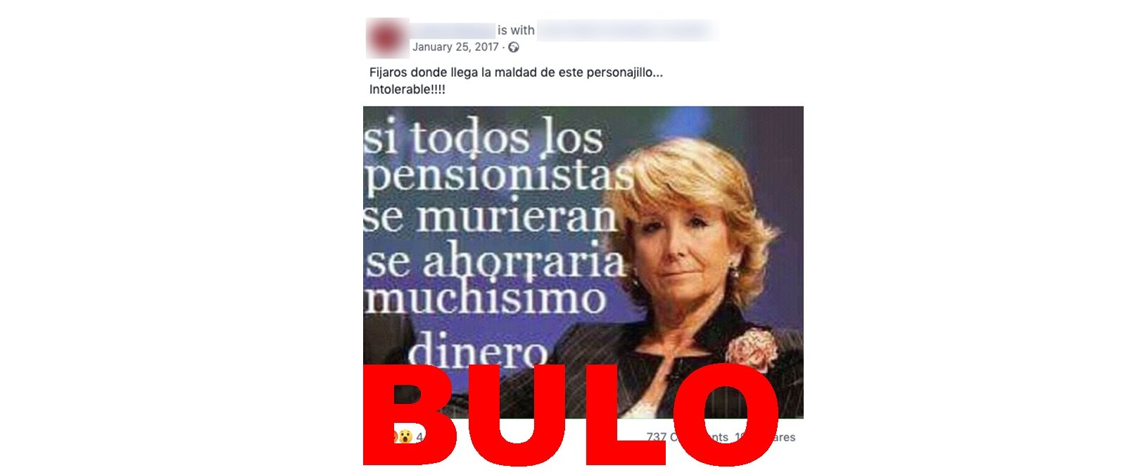 Circula por redes una imagen que atribuye a Esperanza Aguirre la siguiente frase: "si todos los pensionistas murieran se ahorraría mucho dinero". Tal y como ya os contamos en Maldita.es, no es cierto que la expresidenta de la Comunidad de Madrid dijera esa frase. Es un bulo.