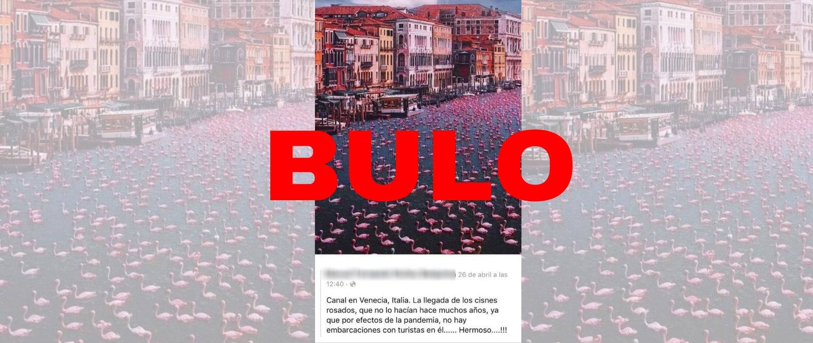 Está circulando en redes sociales una publicación acompañada de una imagen del Gran Canal de la ciudad italiana de Venecia repleta de lo que califica de 'cisnes rosados', aunque parecen flamencos, como si fuera real. El contenido asegura que refleja "la llegada de los cisnes rosados, que no lo hacían hace muchos años, ya que por efectos de la pandemia, no hay embarcaciones con turistas" en el canal. Sin embargo, es un bulo: se trata de un montaje.