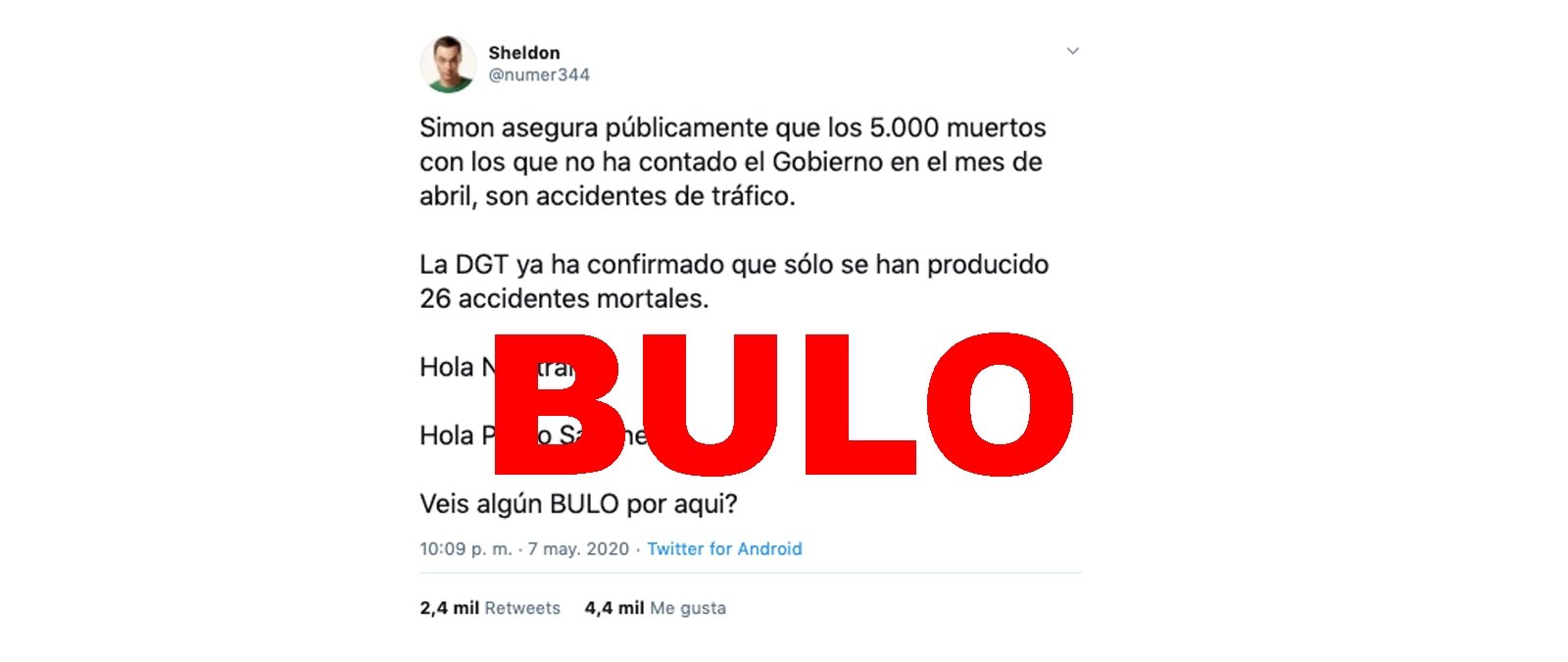 Se ha viralizado una publicación en varias redes sociales en la que se dice que el director del Centro de Coordinación de Alertas y Emergencias Sanitarias, Fernando Simón, aseguró en una rueda de prensa que "los 5.000 muertos con los que no ha contado el Gobierno en el mes de abril, son accidentes de tráfico". Es un bulo: Simón afirmó que "no podemos decir a qué se deben esos incrementos" ya que antes se tienen "que asociar a una causa", y puso varios ejemplos: "No sabemos si se deben a un accidente de tráfico enorme, no sabemos si se deben a un incremento de la mortalidad por infarto, no sabemos si se deben a un incremento de la mortalidad por coronavirus o por cualquier otra enfermedad".