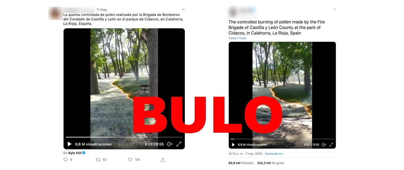 En los últimos días se ha difundido a través de las redes sociales un vídeo que supuestamente muestra "una quema controlada de polen" en el parque de Cidacos, en Calahorra (La Rioja) que habría sido realizada por la "Brigada de Bomberos del Condado de Castilla y León". Es un bulo ya que no fue "una quema controlada", sino un incendio real que fue extinguido por el Consorcio de Extinción de Incendios y Salvamento de La Rioja (CEIS Rioja).