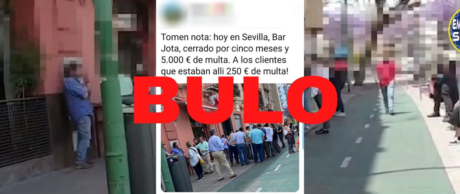 Nos habéis preguntado por un contenido que se ha movido en redes de varias personas en una terraza asegurando que en local de Sevilla llamado Bar Jota las autoridades han "cerrado por cinco meses y 5.000 euros de multa" y que "a los clientes que estaban allí 250 euros de multa". Es un bulo que el Bar Jota haya sido clausurado durante cinco meses como aseguran los mensajes que se están difundiendo. Eso sí, tal y como indica el Ayuntamiento de Sevilla a Maldita.es, la Policia Local sí ha abierto expedientes a los responsables del local, ubicado en la Avenida Luis Montoto (Sevilla), por infracciones a las medidas de desescalada.