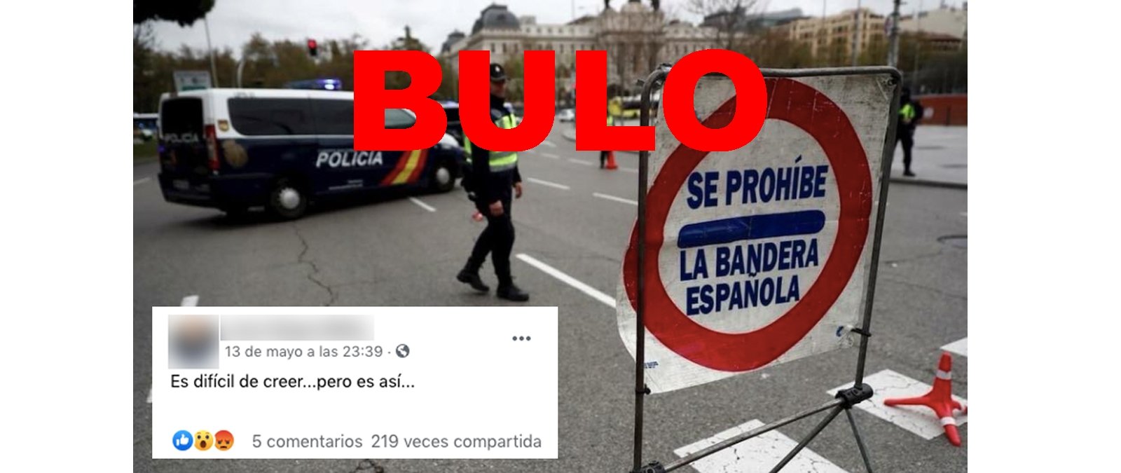 Coincidiendo con el estado de alarma decretado por la COVID-19, circula una imagen de un control policial en la que aparece una señal que pone: "se prohíbe la bandera española". Se trata de un montaje ya que en la versión real de la foto se puede leer: "Alto, control policía".