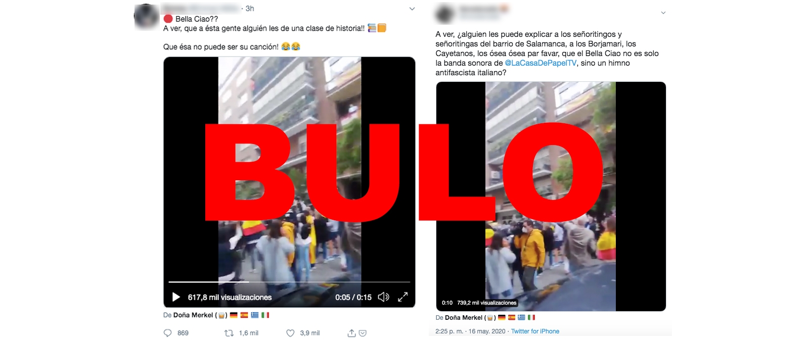 Se está viralizando un vídeo de una protesta en la calle Núñez de Balboa, en el barrio de Salamanca de Madrid, en el que se escucha cómo los manifestantes supuestamente corean la canción 'Bella ciao'. Se comparte con comentarios como "Bella Ciao?? A ver, que a ésta gente alguién les de una clase de historia!!". Sin embargo, es un bulo. Os lo explicamos.