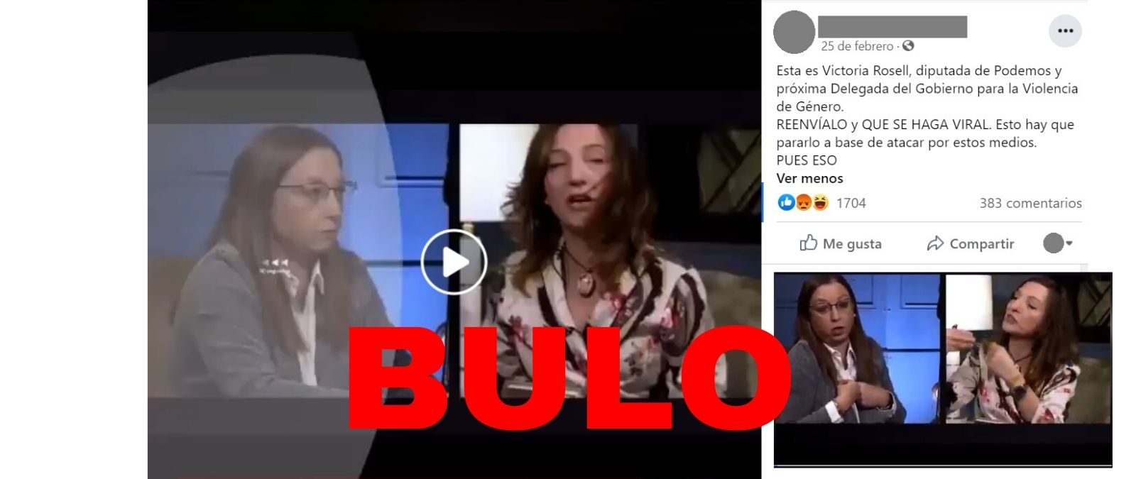 Circula un vídeo en redes sociales en el que dos mujeres debaten sobre la violencia en el seno de las parejas homosexuales. El vídeo se mueve con un mensaje que asegura que una de ellas es la actual delegada del Gobierno para la Violencia de Género, Victoria Rosell. Sin embargo, es un bulo. La mujer que aparece en el vídeo es Pastora de Florencio, presidenta del colectivo Castelló LGTBI* que en el mes de enero acudió a un programa de una cadena de televisión local con la diputada autonómica y portavoz adjunta del grupo parlamentario VOX en las Cortes Valencianas, Llanos Massó.