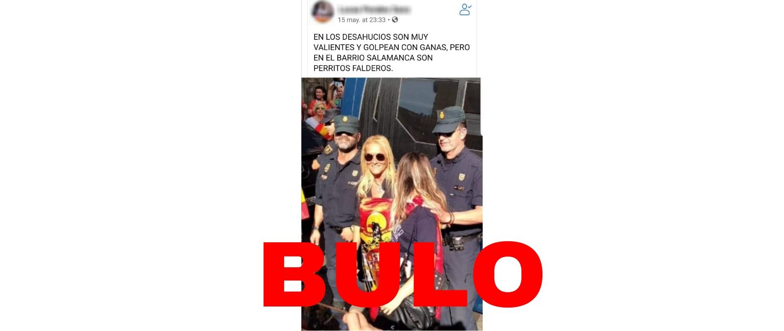 El texto que acompaña a la foto dice que "en los desahucios son muy valientes y golpean con ganas pero en el barrio Salamanca son perritos falderos". Sin embargo, el autor de esta imagen, el periodista Marc Almodóvar, la publicó en su cuenta de Twitter el 27 de octubre de 2019. La foto la hizo mientras cubría la manifestación convocada por Societat Civil Catalana, donde tomó fotografías y vídeos en Via Laietana, frente a la Jefatura Superior de Policía de Cataluña.