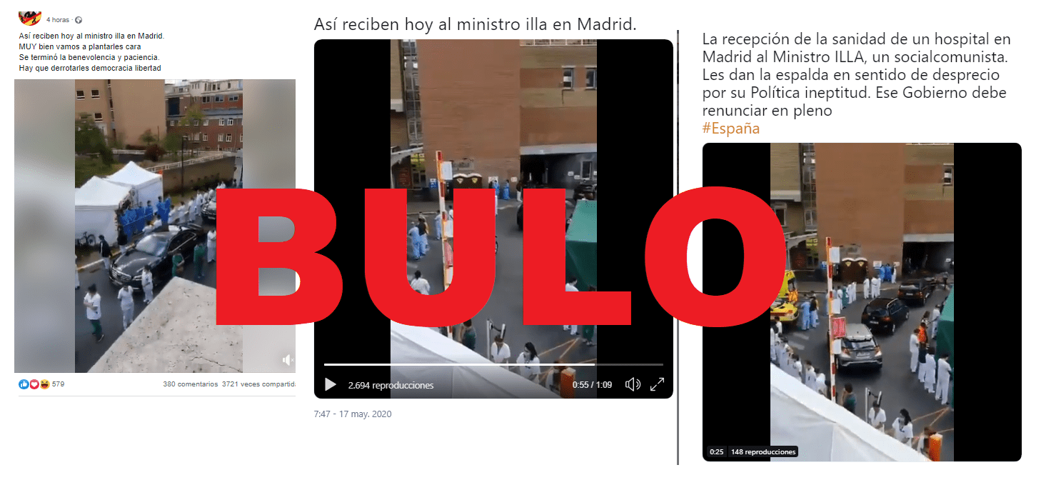Se está viralizando un vídeo de unos sanitarios que al paso de un coche oficial se giran para protestar. En España este vídeo se está moviendo como si fuera una protesta contra el ministro de Sanidad, Salvador Illa, por la gestión de la crisis del coronavirus. También como si la protesta fuera contra la ministra de Igualdad Irene Montero en el hospital Gregorio Marañón, o como si se dirigiera contra el presidente del Gobierno, Pedro Sánchez, "llegando a un hospital".