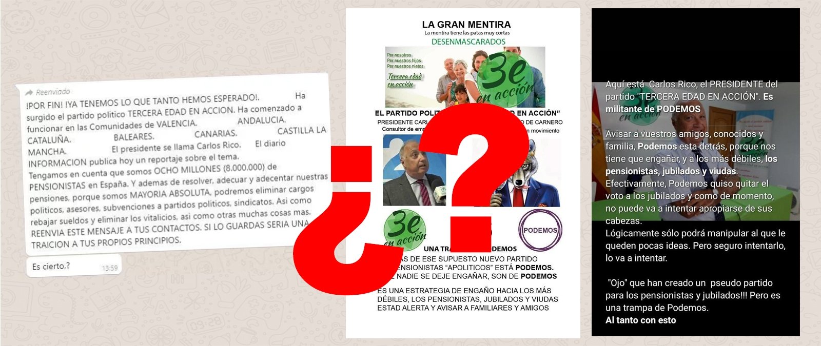 Están circulando imágenes en las que se advierte de que Carlos Rico, presidente de Tercera Edad en Acción, es militante de Podemos y que este partido es una "trampa" de Podemos para "engañar" a "pensionistas, jubilados y viudas".