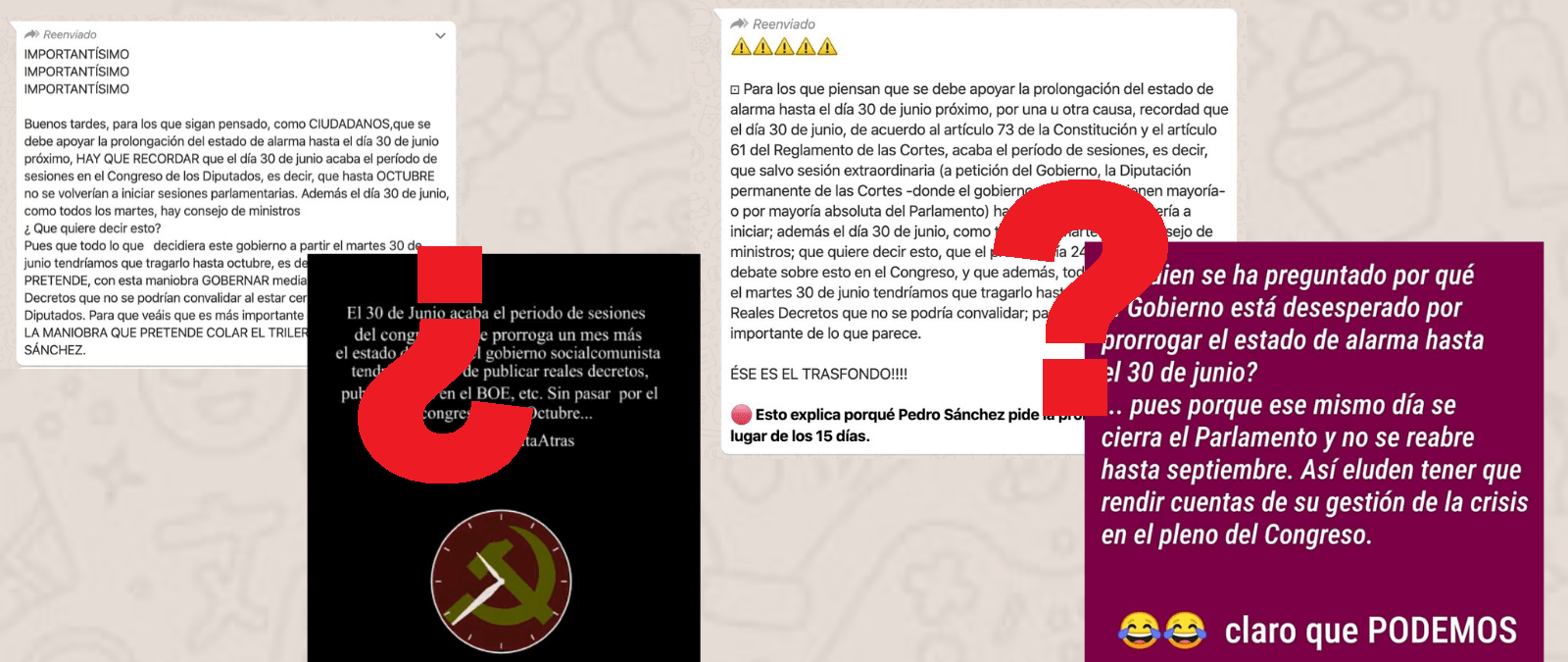 Nos habéis preguntado por un mensaje que circula en redes sociales y que dice que “el Gobierno está desesperado por prorrogar el estado de alarma hasta el 30 de junio” porque “ese mismo día se cierra el Parlamento y no se reabre hasta septiembre”. Un mensaje similar circula también como parte de una cadena de WhatsApp en la que se especifica que “que hasta octubre no se volverían a iniciar sesiones parlamentarias” y que “todo lo que se decidiera el martes 30 de junio”, ya sean reales decretos u otros textos legislativos en relación con la crisis del coronavirus, “tendríamos que tragarlo hasta octubre”. Además, este mismo contenido se mueve incluso en formato vídeo. Os explicamos lo que sabemos: