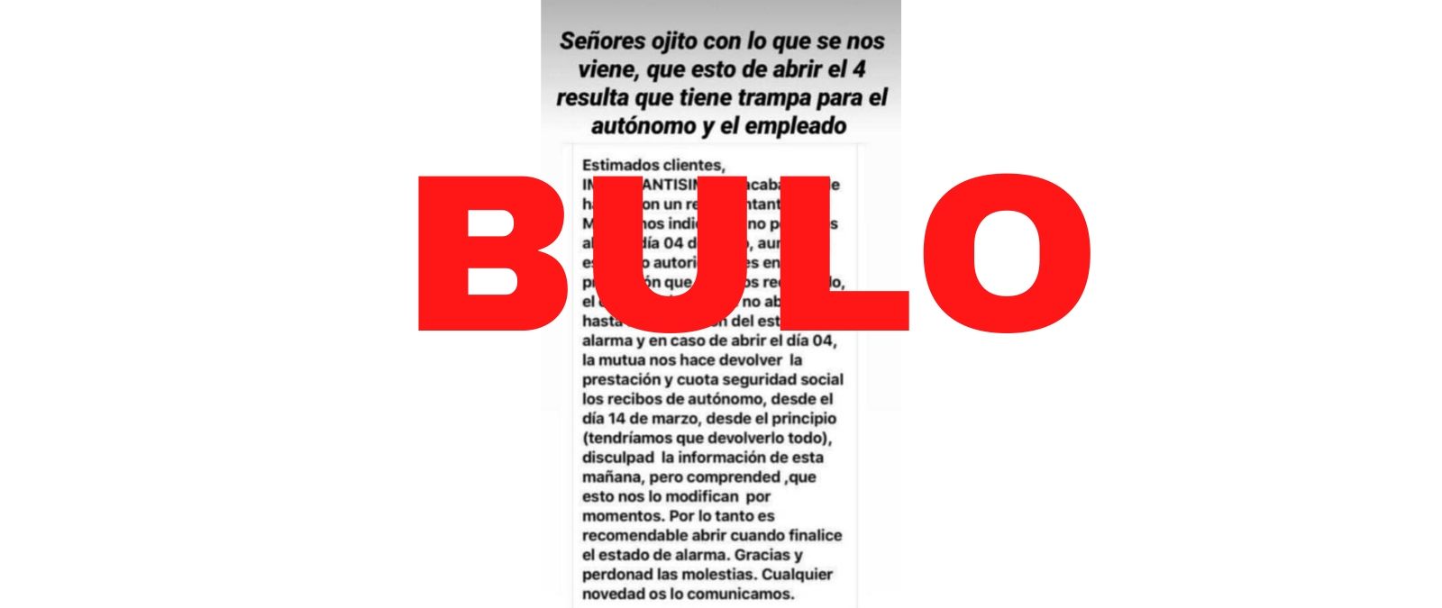 Está circulando una cartela en la que aseguran que, a partir del próximo 4 de mayo, fecha anunciada por el Gobierno para el inicio de la "fase cero" de desescalada en la que se permite la apertura del comercio minorista y de restaurantes sin consumo en el local, los autónomos que han recibido la prestación (por cese de actividad) "deberán devolver tanto la cuantía percibida de esta prestación como la cuota de Seguridad Social desde que se declaró el estado de alarma" (14 de marzo). Así, aseguran que es recomendable abrir directamente cuando finalice el estado de alarma. Es un bulo. Todos aquellos que hayan sido beneficiarios de la prestación extraordinaria por cese de actividad, que incluye también la exoneración de cuotas a la Seguridad Social de forma temporal, que puedan abrir su negocio al inicio de la desescalada seguirán percibiéndola hasta el último día del mes que finalice el estado de alarma, tal y como indican desde el Ministerio de Trabajo , Migraciones y Seguridad Social. Hasta el momento, el estado de alarma se ha prorrogado hasta el 10 de mayo.