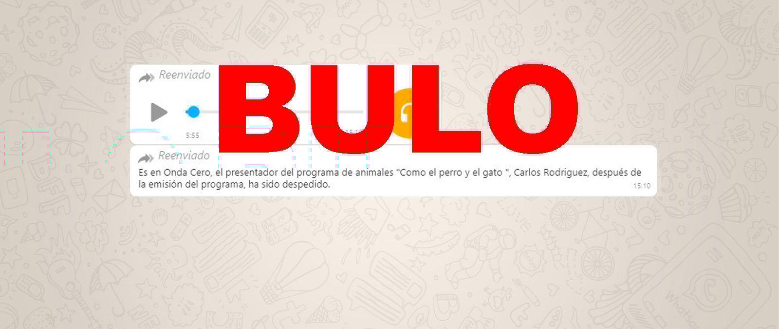 Nos estáis preguntando a través de WhatsApp y de La Buloteca por una cadena de WhatsApp en la que se asegura que el presentador de Como el perro y el gato, Carlos Rodríguez, ha sido despedido de Onda Cero después de criticar al Gobierno en uno de sus programas. El texto va acompañado de un corte de audio en el que Rodríguez cuenta que su madre ha sido trasladada al hospital por COVID-19 y critica al Ejecutivo por su gestión de la pandemia de coronavirus. Aunque el audio sí que es un fragmento del programa que presenta, no es cierto que lo hayan despedido de Onda Cero, tal y como han desmentido tanto él mismo como Atresmedia radio, grupo al que pertenece la cadena.