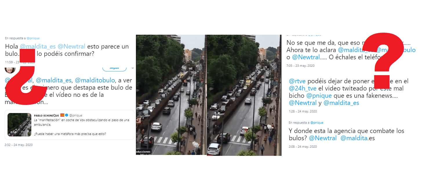 Se está viralizando y nos estáis preguntando si el vídeo donde una ambulancia trata de pasar entre los coches en una manifestación de Vox es real. Se está diciendo que es de 2017, pero la realidad es que está grabado el sábado 23 de mayo de 2020 en Santander, durante la manifestación convocada por Vox.
