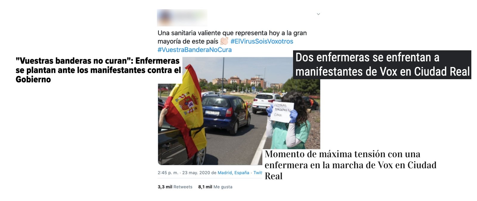 En los últimos días se han viralizado varios vídeos e imágenes de una mujer protestando contra una manifestación convocada por Vox el pasado 23 de mayo en Ciudad Real. Varios medios aseguraron que la mujer era enfermera, pero desde la Jefatura Superior de Policía Nacional de Castilla-La Mancha nos dicen que "no es personal sanitario". Por su parte, la Consejería de Sanidad de la región nos asegura que "en el Hospital de Ciudad Real no tienen constancia de que la enfermera del vídeo trabaje allí, lo que no quita que sea enfermera de otro hospital".
