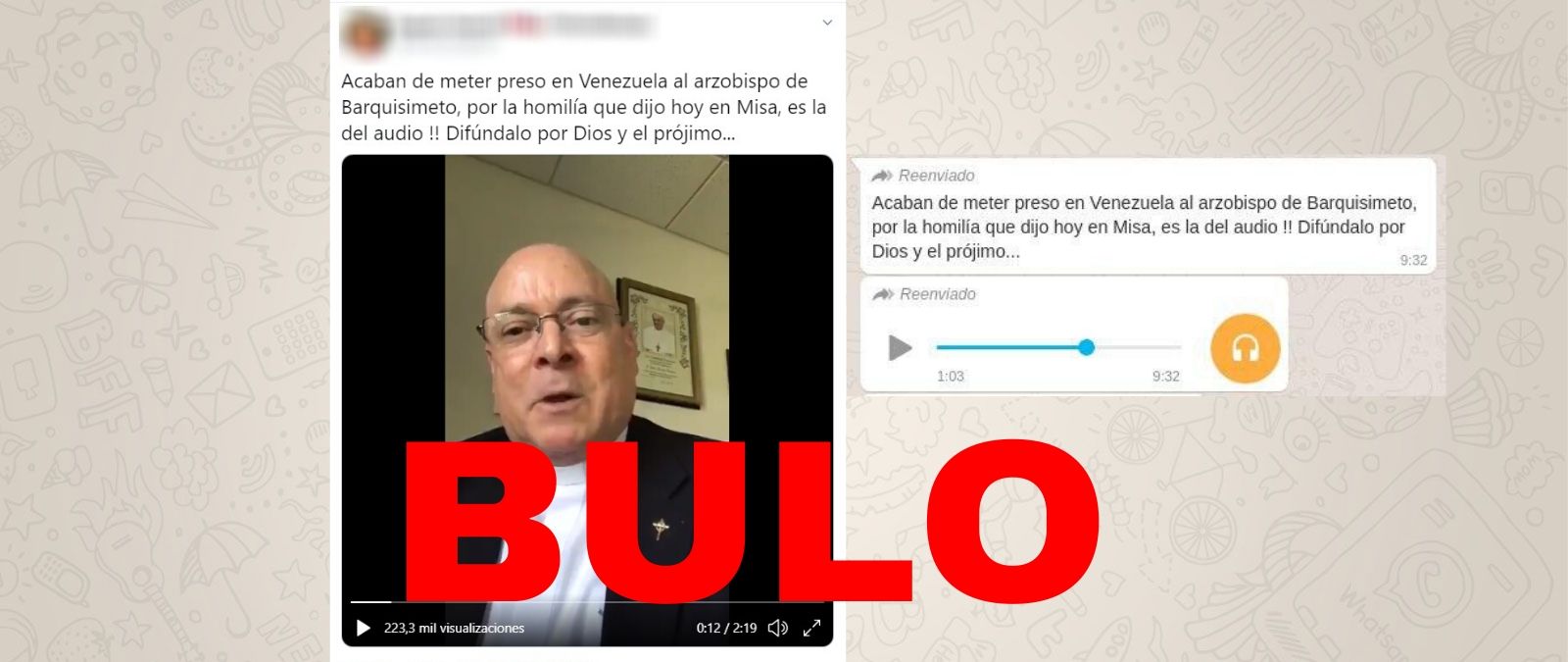 El contenido que se está difundiendo a través de WhatsApp dice que "acaban de meter preso en Venezuela al arzobispo de Barquisimeto, por la homilía que dijo hoy en Misa, es la del audio !! Difúndalo por Dios y el prójimo..." (sic). Sin embargo, el propio Basabe lo negaba en su cuenta de Twitter y decía que es "completamente falso".