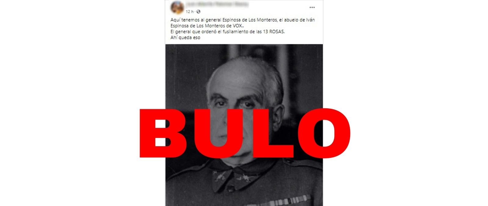 Vuelve a circular en redes sociales que el gobernador militar de Madrid en 1939, Eugenio Espinosa de los Monteros ,"firmó y ordenó el fusilamientos de las 13 rosas" y que su nieto es el diputado de Vox Iván Espinosa de los Monteros. Es un bulo. Se trata de un contenido que ya desmentimos en noviembre de 2019 cuando se viralizó en Twitter tras el 80º aniversario del fusilamiento de las conocidas como las Trece Rosas, que se produjo el 5 de agosto de 1939 en Madrid.