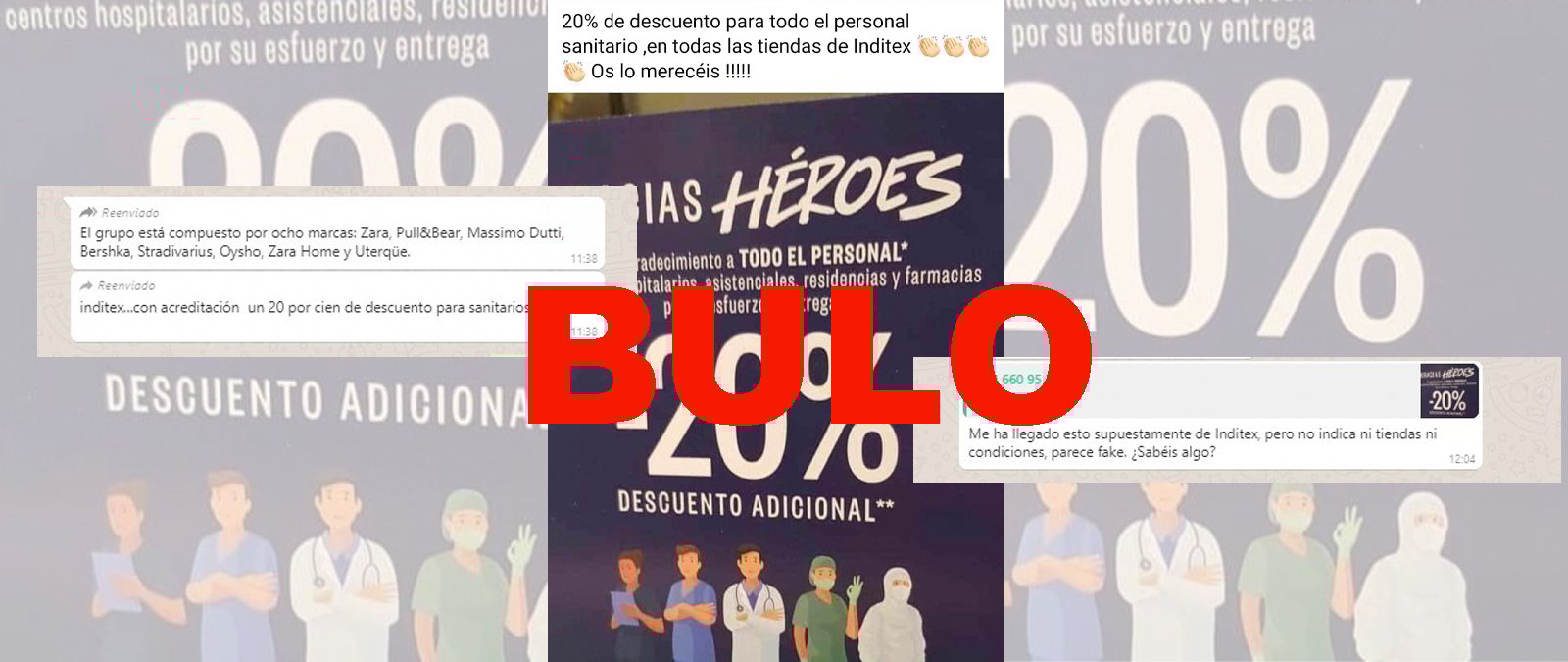 En la imagen que se está difundiendo se lee un cartel con el mensaje: "Gracias héroes. En agradecimiento a todo el personal de centros hospitalarios, asistenciales, residencias y farmacias por su esfuerzo y entrega: -20% descuento adicional". En él no aparece ningún nombre de ninguna marca de ropa, pero se está difundiendo como si fuera una campaña de Inditex y con mensajes que aseguran que es para las marcas "Zara, Pull&Bear, Massimo Dutti, Bershka, Stradivarius, Oysho, Zara Home y Uterqüe".