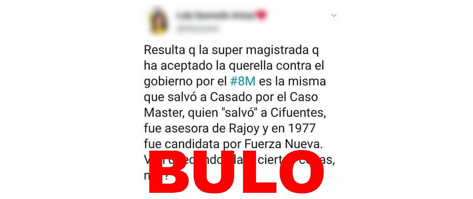 Coincidiendo con la imputación del delegado del Gobierno en la Comunidad de Madrid, José Manuel Franco, por permitir la celebración de la marcha del 8M unos días antes de que se decretara el estado de alarma por la COVID-19, ha empezado a circular una publicación en la que se asegura que Carmen Rodríguez-Medel, la jueza que lo ha citado a declarar, fue candidata de Fuerza Nueva en 1977. Es un bulo: ni estuvo en las listas de ese partido ni "salvó" a Cristina Cifuentes y Pablo Casado por el 'caso máster'.