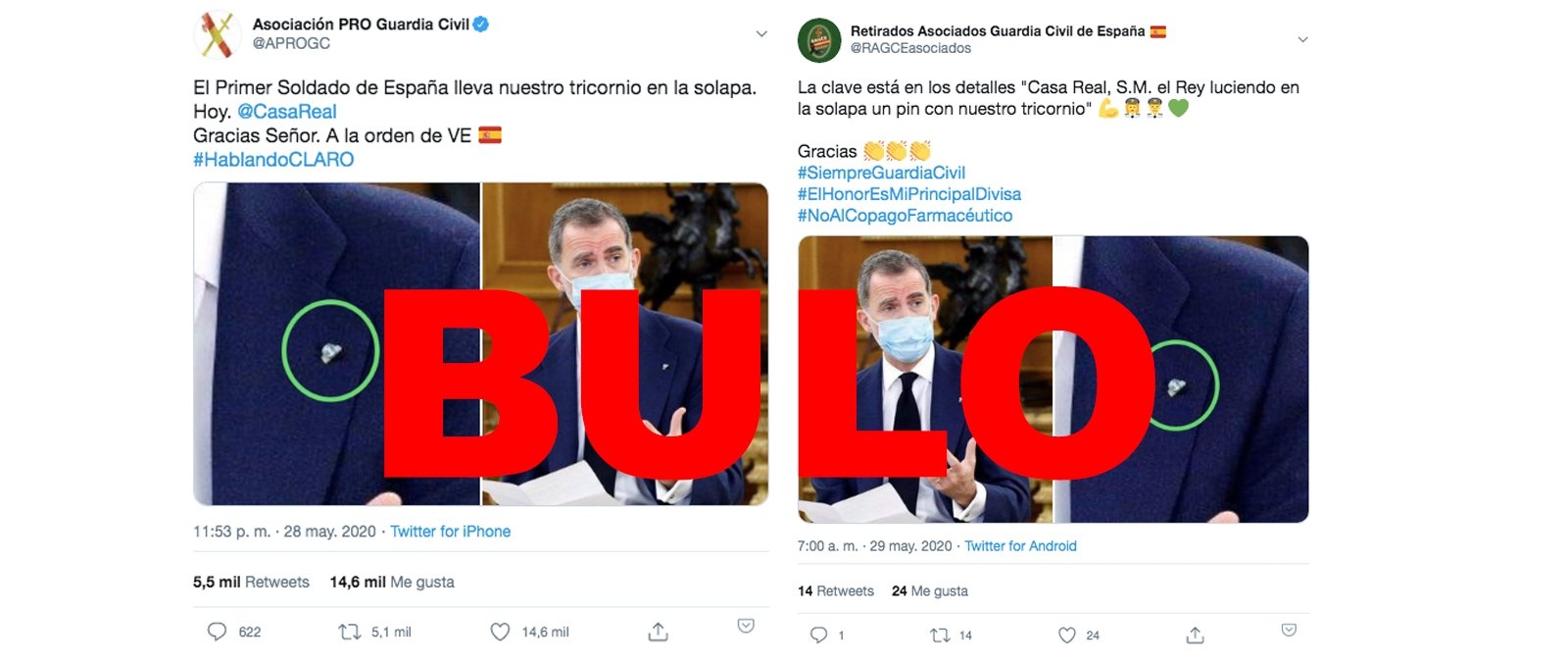 Se ha viralizado una imagen del rey Felipe VI en una reunión que mantuvo ayer, 28 de mayo, con jóvenes talentos en la Zarzuela. En una de las fotos del evento, publicadas por la Casa Real, vemos que el rey lleva lo que parece ser un pin en su chaqueta. En redes sociales, se ha afirmado que se trata de un pin del tricornio de la Guardia Civil. Es un bulo.