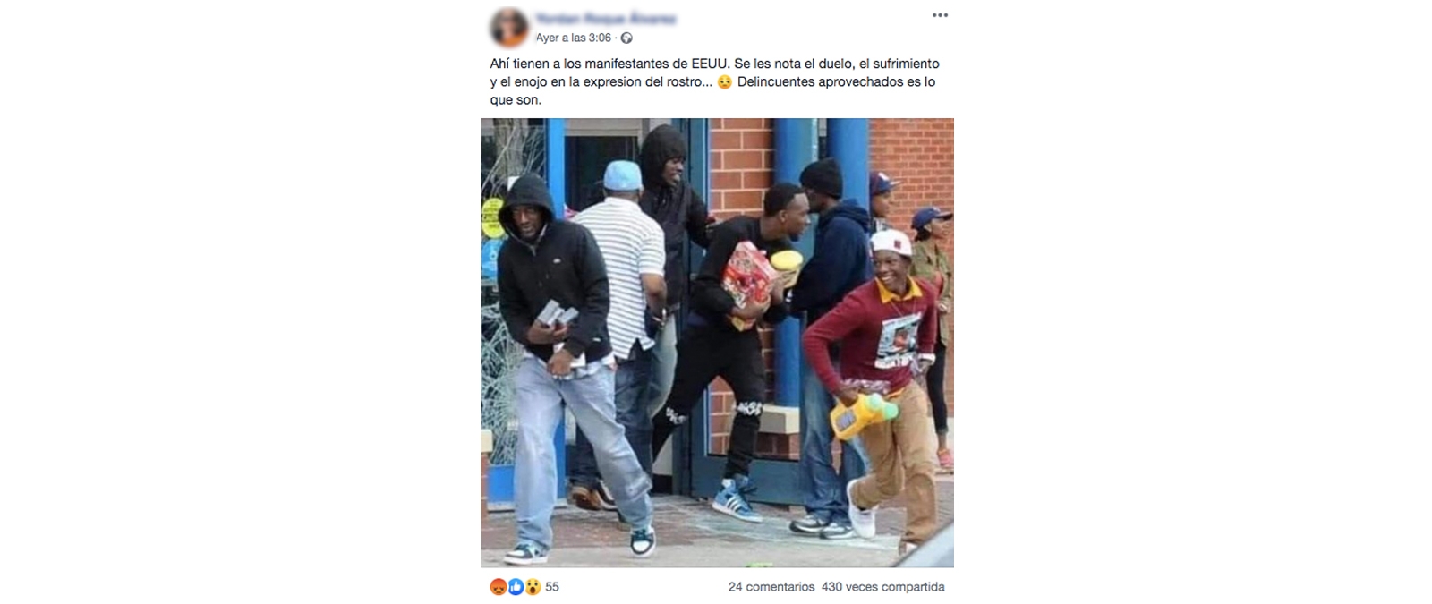 Se está compartiendo una fotografía en la que se ve a varias personas salir de un establecimiento con productos en los brazos. A la imagen le acompañan comentarios como "ahí tienen a los manifestantes de EEUU (...) Delincuentes aprovechados es lo que son". Pero es un bulo, la foto no está relacionada con las actuales protestas contra el racismo en Estados Unidos tras la muerte de George Floyd, es una foto de 2015.