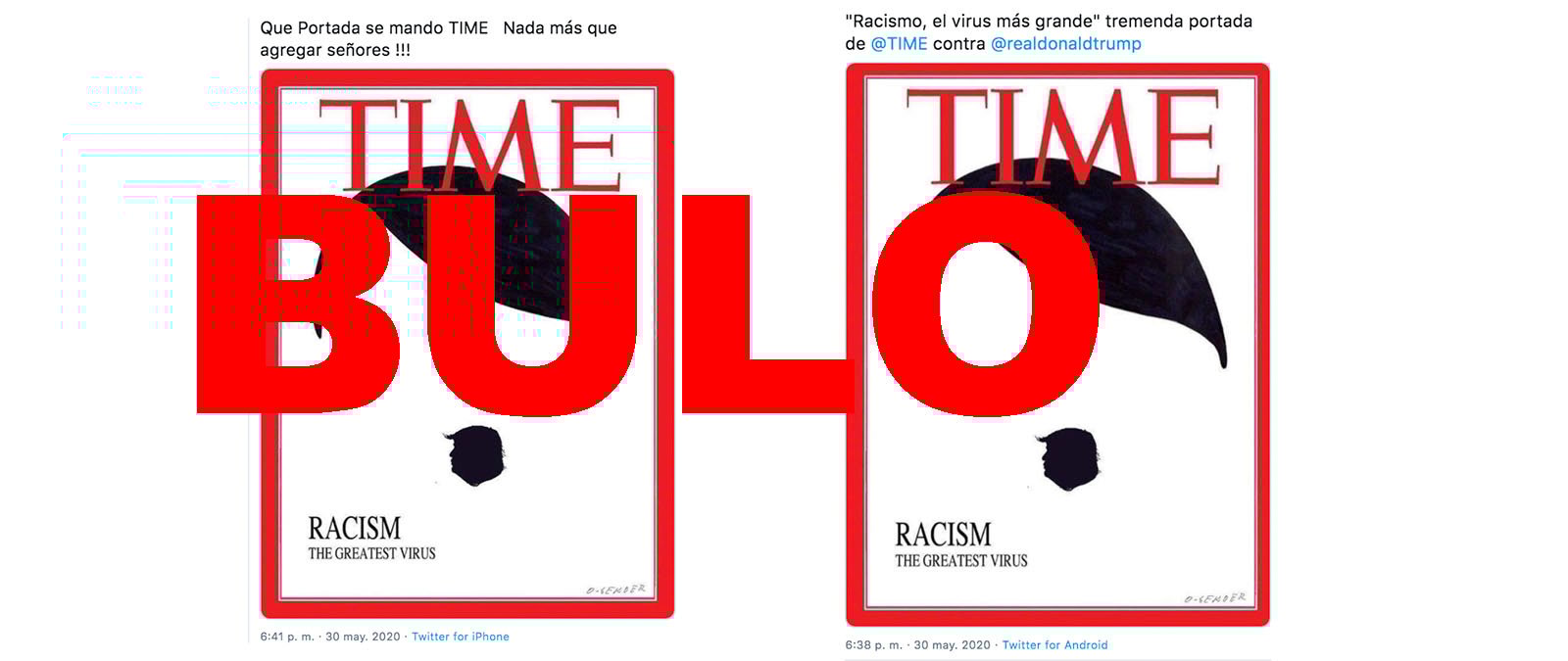 En las últimas horas, está circulando una supuesta portada de la revista Time con una imagen del flequillo de Hitler en la que aparece la silueta de Donald Trump como bigote y con el titular "RACISM THE GREATEST VIRUS". Es un bulo. La portada falsa no aparece en el archivo de Time y coincide con las protestas por la muerte del afroamericano George Floyd tras sufrir violencia policial en Minneapolis (EE.UU.) y la detención de un policía acusado de su asesinato. La imagen es una caricatura del artista belga Luc Descheemaeker.
