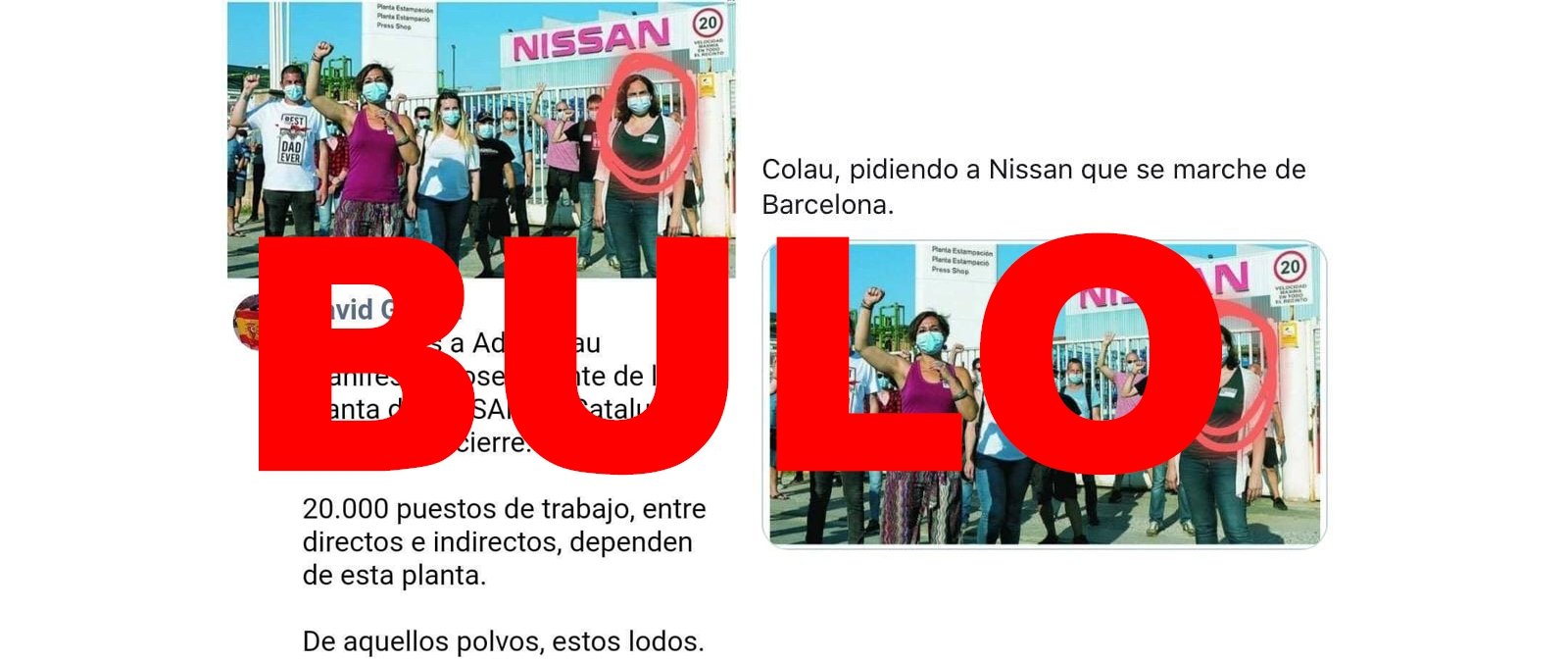 Se ha viralizado una fotografía en la que aparece la alcaldesa de Barcelona, Ada Colau, enfrente de la planta de Nissan en Montcada i Reixac (Barcelona). Se difunde con mensajes que afirman que Colau se estaba manifestando para pedir su cierre. Es un bulo.