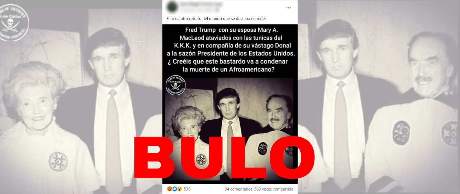 El mensaje con el que se mueve la foto dice "Fred Trump con su esposa Mary A. MacLeod ataviados con las túnicas del K.K.K. y en compañía de su vástago Donal a la sazón Presidente de los Estados Unidos. ¿Creéis que este bastardo va a condenar la muerte de un Afroamericano?" (sic).