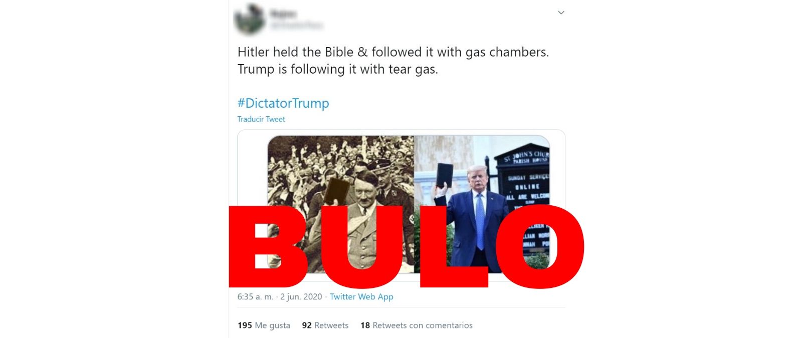 El pasado lunes 1 de junio, el presidente de Estados Unidos, Donald Trump, posaba sujetando una biblia en la puerta de la iglesia de St. John en Washington para unas fotos, coincidiendo con las protestas contra el racismo que se están desarrollando en el país tras la muerte de George Floyd. Es una de esas capturas las que han utilizado algunos usuarios en redes sociales para comparar al presidente estadounidense con Hitler.