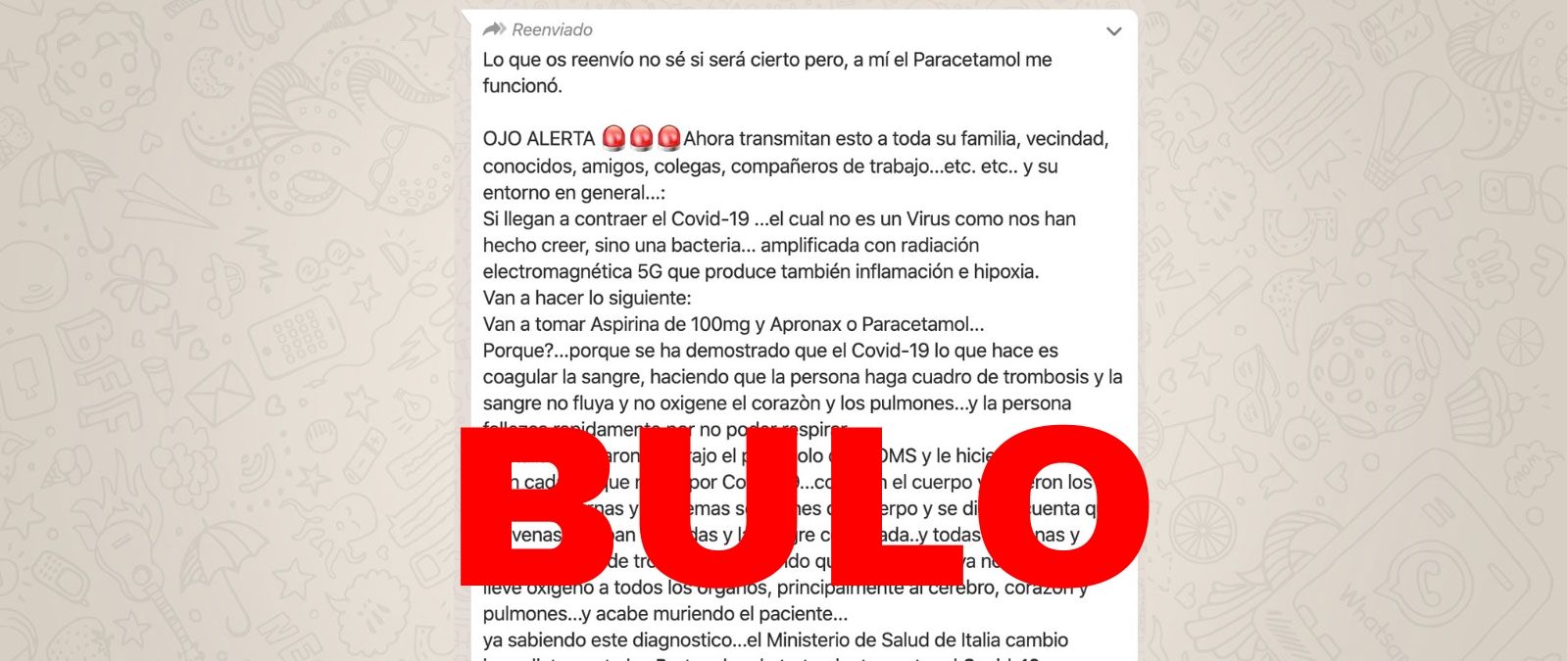Nos habéis preguntado por una cadena que circula por WhatsApp que dice que el coronavirus no es un virus, "como nos han hecho creer", sino que es "una bacteria, amplificada con radiación electromagnética 5G que produce también inflamación e hipoxia". Además, asegura que los contagiados deben tomar "Aspirina de 100mg y Apronax o Paracetamol" ya que supuestamente se ha demostrado que la COVID-19 coagula la sangre después de que en Italia se saltaran "el protocolo de la OMS" y realizaran la autopsia a un cadáver.