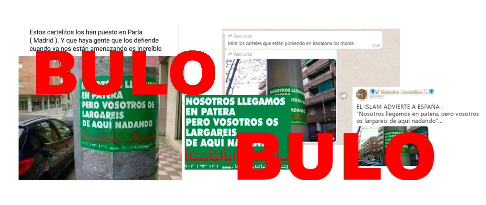 Cada cierto tiempo vuelven a circular fotos de pegatinas que aseguran que "nosotros llegamos en patera pero vosotros os largareis de aquí nadando", insinuando que han sido pegadas por personas extranjeras. Sin embargo, las pegatinas, que supuestamente han aparecido en lugares como Badalona (Barcelona) o Parla (Madrid), fueron creadas y distribuidas por el partido Democracia Nacional.