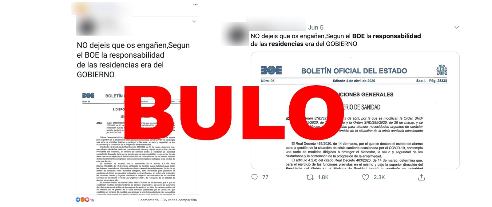 Está circulando un mensaje en el que se dice que según el BOE la responsabilidad de las residencias durante la crisis de la COVID-19 era del Gobierno. En concreto se hace referencia a la orden ministerial SND/322/2020 dictada por el Ministerio de Sanidad y publicada el pasado 4 de abril en el BOE.