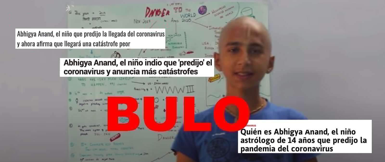 Varios medios de comunicación han difundido en los últimos días un vídeo de un niño indio de 14 años llamado Abhigya Anand que supuestamente habría predicho el coronavirus en 2019. Pese a que el "astrólogo" sí que menciona la posibilidad de que haya enfermedades en los últimos meses de 2019 y los primeros de 2020, no hace mención al coronavirus y vaticina otros sucesos, como la Tercera Guerra Mundial, que no han ocurrido. Esas predicciones erróneas, que según él se resolverán rezando y comiendo verduras, no han sido cuestionadas por muchos de los medios que se han hecho eco de ellas.