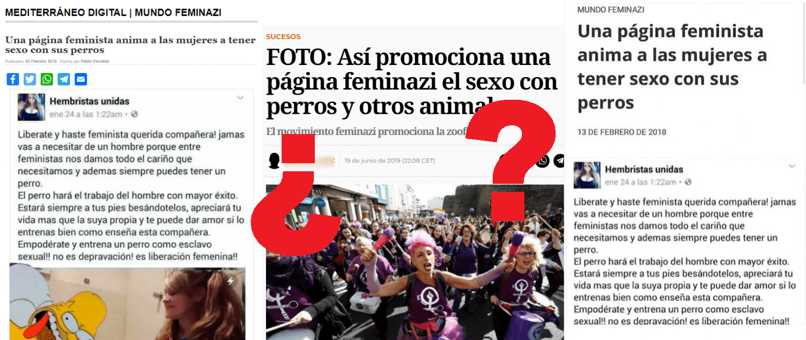 Nos habéis preguntado tanto por nuestro servicio de WhatsApp como por La Buloteca acerca de un contenido publicado por Mediterráneo Digital y La Nación Digital sobre que “una página feminista anima a las mujeres a tener sexo con sus perros” a raíz de una supuesta publicación en Facebook.