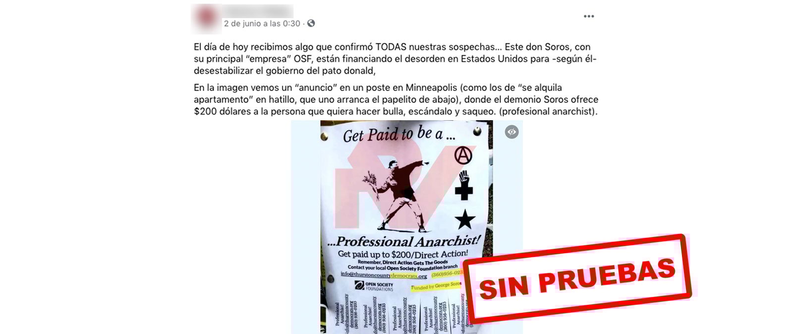 Circula en redes un cartel atribuido al fundador de Open Society Foundations, George Soros, y a los Demócratas del condado de Thruston (Washington), en el que se asegura que pagarán 200 dólares a "anarquistas profesionales" a cambio de "acción directa". Sin embargo, no hay pruebas de que sea así puesto que tanto Open Society Foundations como los demócratas han negado tener relación con ello. Además, siempre circula con la misma imagen y acusa sin pruebas a Soros y a los demócratas de estar detrás de la campaña.