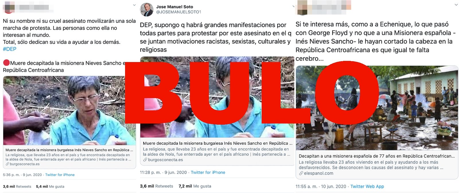 Se ha difundido mucho por Twitter una noticia de la muerte de la misionera española Inés Nieves Sancho en República Centroafricana con mensajes que la relacionan en el tiempo con las protestas por el homicidio de George Floyd. Además, estos mensajes dicen que el asesinato de la misionera es actual. Es un bulo: el asesinato de la misionera no es actual ni coincide en el tiempo con las protestas por el homicidio de Floyd, es un suceso de mayo de 2019.