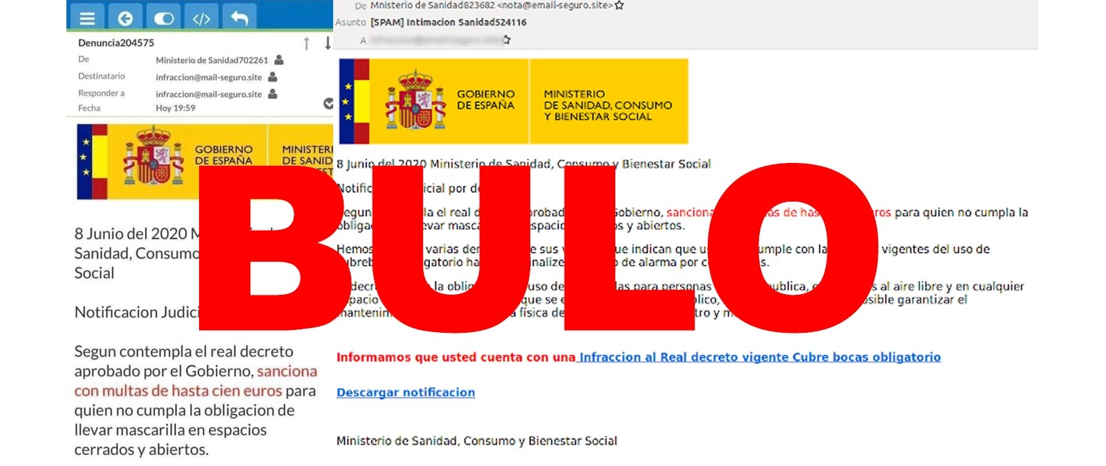 Nos habéis preguntado por un correo electrónico, supuestamente del "Ministerio de Sanidad, Consumo y Bienestar Social", en el que te notifican que has cometido una infracción por no llevar el "cubrebocas" (mascarilla) obligatorio en esta crisis sanitaria del coronavirus y que han sido tus vecinos quienes te han denunciado por ello. Es un bulo. Es un correo malicioso, según la Oficina de Seguridad del Internauta (OSI) y el Ministerio de Sanidad nos ha confirmado que no es una comunicación suya y que no tiene capacidad para sancionar.