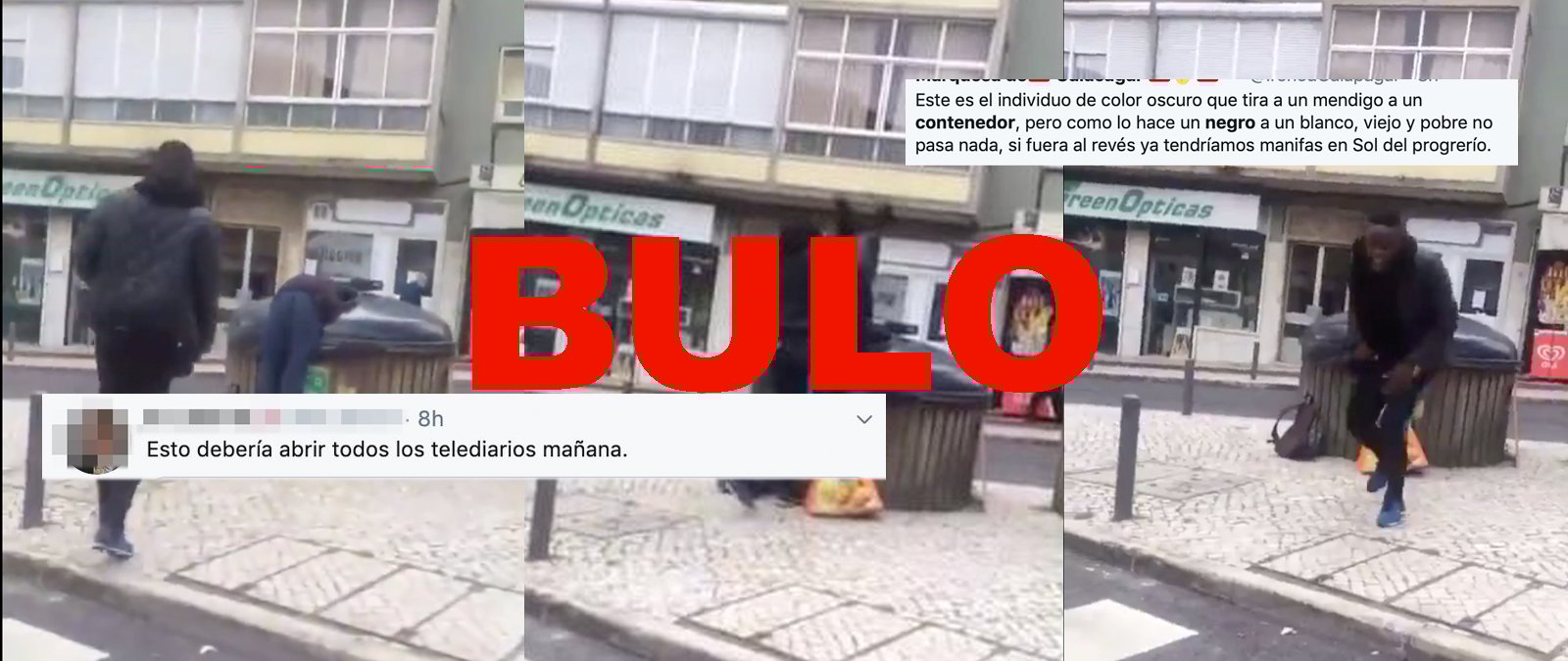 Nos estáis preguntando por un vídeo que está circulando por redes sociales en el que se ve a un hombre negro bajar de un coche y meter en un contenedor de basura a otro hombre. Estas imágenes se están difundiendo como actuales y relacionadas con España. Es un bulo: el vídeo no es actual, se difunde desde 2017, y no está grabado en España, sino en Portugal.
