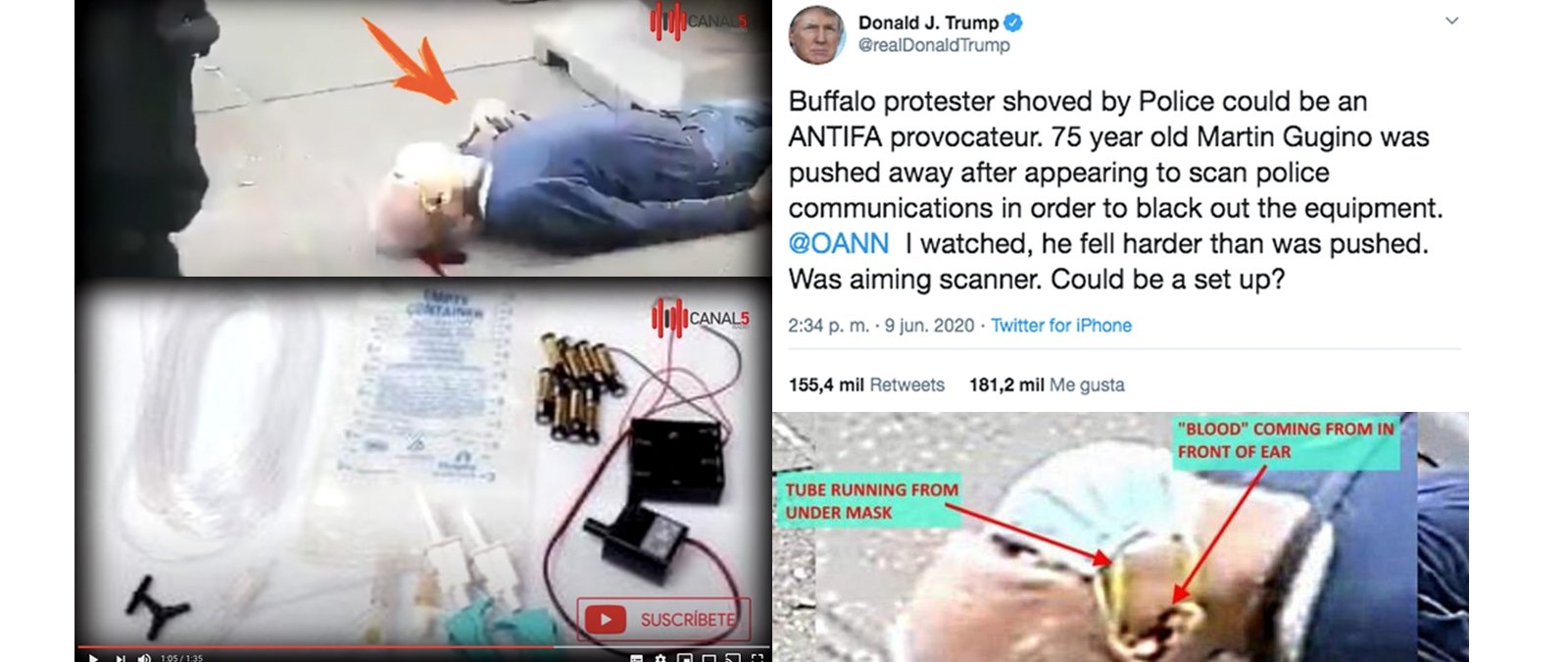 Se han viralizado contenidos que apuntan que Martin Gugino, el manifestante de 75 años que se golpeó con el suelo tras ser empujado por dos agentes de la policía de Buffalo (EEUU), no estaba realmente herido, sino que accionó un mecanismo que tenía instalado en su cuerpo y oreja para que pareciera que sangraba.