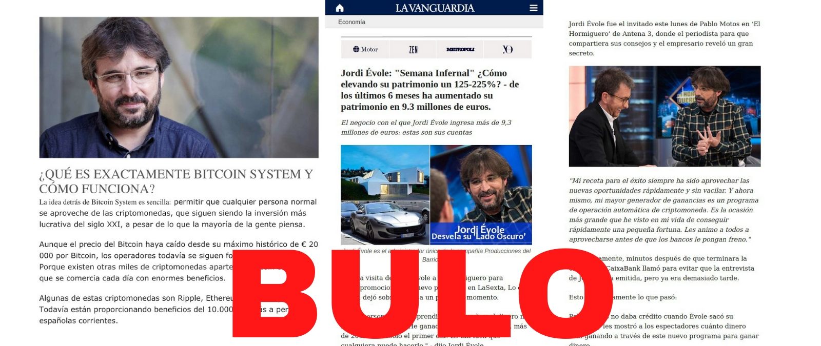 Esta vez han usado al periodista Jordi Évole, quien según el timo habló del dinero que había ganado a través de 'Bitcoin System', pero eso no ha ocurrido: Jordi Évole no ha hablado en El Hormiguero de 'Bitcoin System' ni hay pruebas de que haya invertido allí. Es un timo sobre el que ya os hemos alertado y que ahora vuelve a circular.