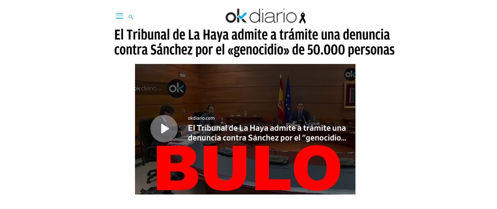 La web OkDiario ha publicado este 9 de junio un contenido titulado: "El Tribunal de La Haya admite a trámite una denuncia contra Sánchez por el «genocidio» de 50.000 personas", un titular que ha sido modificado posteriormente para señalar que La Haya en realidad ha "registrado" la denuncia. Además, el autor del contenido ha asegurado en Twitter que la respuesta de la Corte Penal Internacional (CPI) informaba a los denunciantes de que su escrito había sido "duly entered" (debidamente registrada, en inglés), no que hubiera sido "admitida a trámite". Por su parte, la CPI ha asegurado a Maldita.es que han recibido la comunicación y que el primer paso es comprobar si entra dentro de sus competencias, por lo que, a fecha de 16 de junio de 2020, es un bulo que hayan admitido a trámite dicha denuncia.