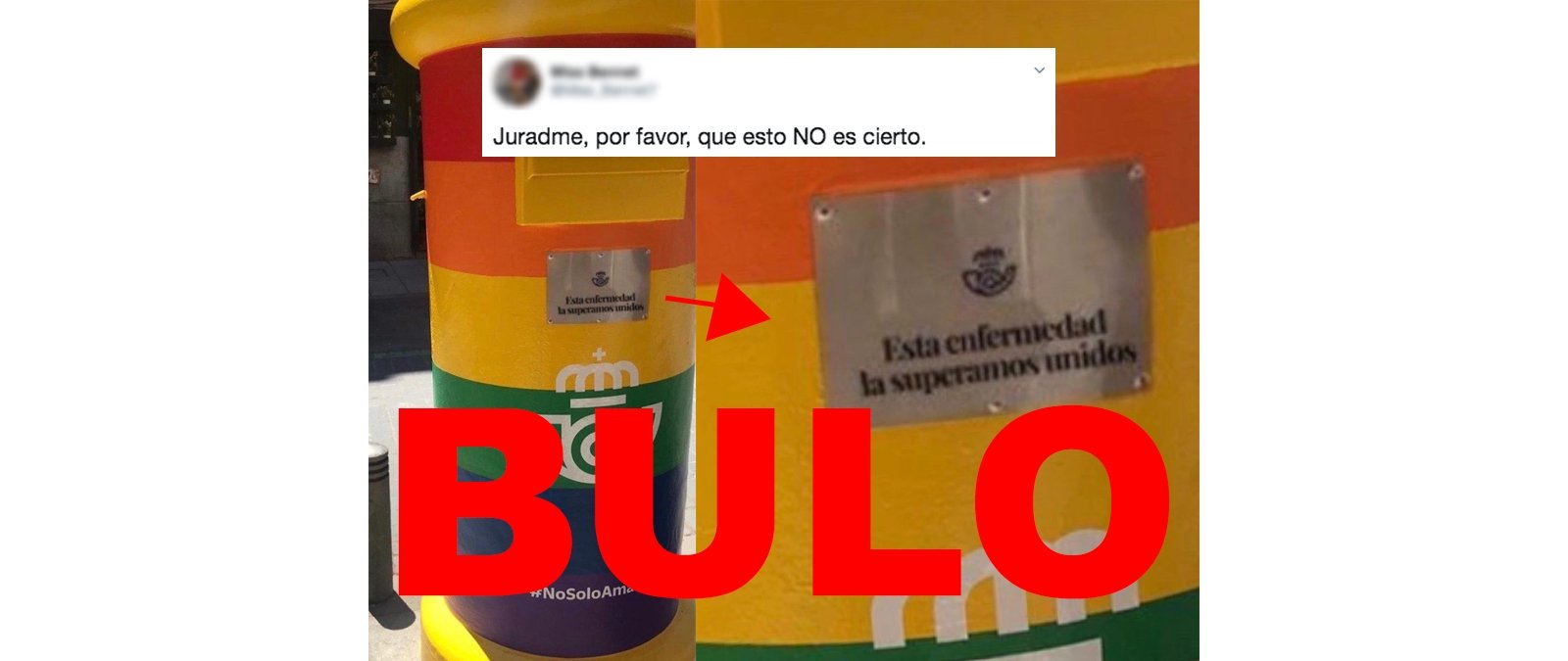 Se está compartiendo en redes sociales una imagen de un buzón de Correos con la bandera LGTBI y con una placa metálica en la que leemos: "Esta enfermedad la superamos unidos", que es muy similar al lema '#EsteVirusLoParamosUnidos' de la campaña del Gobierno para incentivar las medidas de distanciamiento social por el coronavirus.