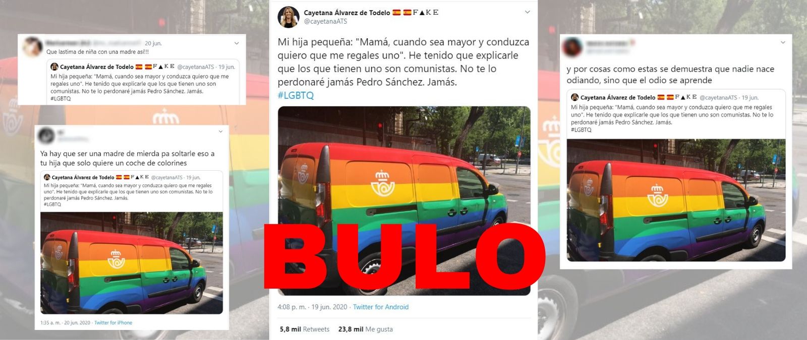 Está circulando un tuit escrito supuestamente por la portavoz del Partido Popular en el Congreso de los Diputados, Cayetana Álvarez de Toledo, en el que dice que ha tenido que explicarle a su hija que quienes tienen una furgoneta de Correos pintada con la bandera arcoíris "son comunistas". Es un bulo. El tuit es de una cuenta que se define como "fake".