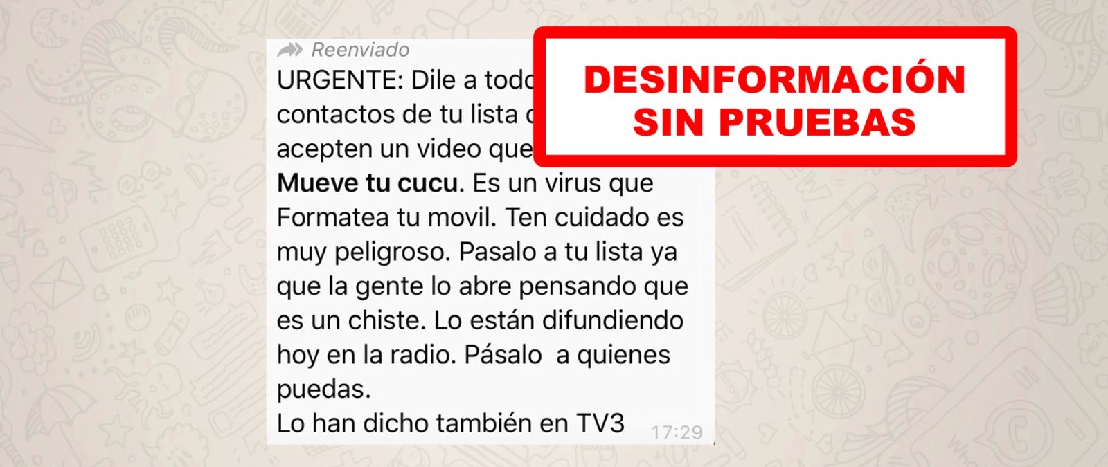 Está volviendo a circular una cadena de WhatsApp que dice que hay un vídeo llamado "Mueve tu cucu" que circula como una broma y que te formatea el móvil. Pide, además, que le digas "a todos los contactos de tu lista" que no lo acepten. Pero no hay pruebas de que sea real, como ya os contamos en marzo.
