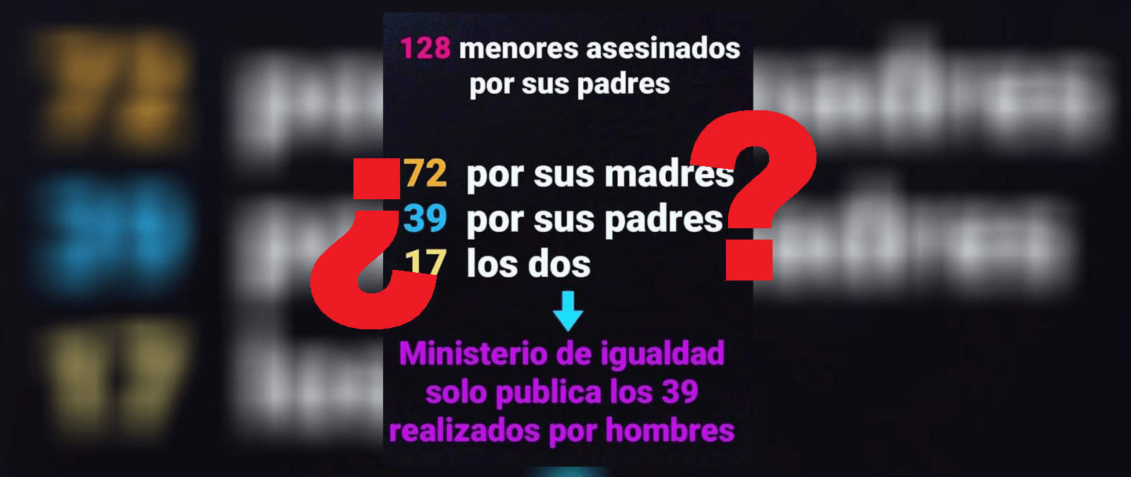 Nos habéis preguntado por una imagen que circula en redes sociales y que dice que “128 menores han muerto a manos de sus progenitores”, de los cuales “72 [han sido asesinados] por sus madres, 39 por sus padres y 17 [por] los dos” pero que, sin embargo, “el Ministerio de Igualdad sólo publica los 39 [asesinatos] realizados por hombres”. Os explicamos lo que sabemos: