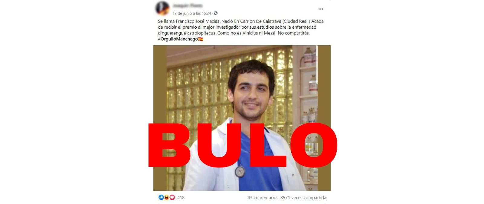 Está circulando la foto de un supuesto médico con un mensaje que dice que es Francisco José Macías, nacido en Carrión de Calatrava (Ciudad Real) y que "acaba de recibir el premio al mejor investigador por sus estudios sobre la enfermedad dinguerengue astrolopitecus". Es un bulo. La persona de la imagen es el actor y cantante Fran Perea y la supuesta enfermedad no existe.